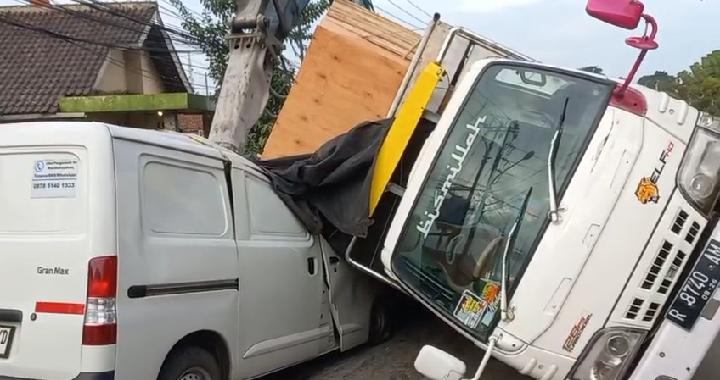 Truk Muatan Triplek Terbalik Timpa Mobil Lain Di Parungpanjang